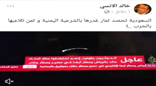 شن عدد من قيادات واعضاء حزب التجمع اليمني للإصلاح ( الاخوان المسلمين)، هجوماً لاذعاً على دول التحالف العربي بقيادة المملكة العربية السعودية، معلنين تأييدهم للقصف الحوثي الذي طال اراضي المملكة العربية السعودية . وقال القيادي الإصلاحي "خالد الانسي"، في منشور عبر صفحته بموقع التواصل الاجتماعي فيس بوك،: " السعودية تحصد ثمار غدرها بالشرعية اليمنية و ثمن تلاعبها بالحرب ..!"؛ معتبراً دعم التحالف العربي للشرعية في اليمن تلاعب . وأرفق "الانسي" في منشوره فيديو لنشرة اخبار قناة الجزيرة المملوكة لدولة قطر، ظهر فيه خبر عاجل حول استهداف صواريخ الحوثيين عدد من مطارات المملكة العربية السعودية . وكانت قيادات إصلاحية "إخوانية" سارعت بفتح قنوات تواصل بينها وبين جماعة "الحوثي"، وذلك عقب إعلان المقاطعة لدولة قطر بسبب سياستها في دعم الإرهاب وتمويله، وإبرام اتفاقات بين الطرفين اللذين يمثلان أمام العالم أنهما عدوان وفي الباطن صديقان مقربان ينفذان أجندة خارجية لتدمير والأضرار باليمن والمنطقة. ويؤكد المحللون أن قطر سعت منذ اندلاع الحرب في اليمن مطلع 2015 من خلال مشاركتها في قوات التحالف العربي إلى زيادة أدوار ذراعها في البلد المتمثلة بالإخوان ودفعهم إلى الحكومة الشرعية للعب أدوار مزدوجة وخبيثة بدء من عرقلة الانتصارات الميدانية للتحالف والشرعية في عدة محافظات كما حدث في تعز وإب والبيضاء ومأرب والجوف، وعقد اتفاقات سرية مع الميليشيات الانقلابية، والإخوان، تتضمن تسهيلات لمواصلة احتلال المحافظات وتثبيت أقدامهم في المدن اليمنية. هذا وقد عبرت عدداً من الدول العربية والغربية، عن ادانتها للمحاولات المستمرة التي تقوم بها مليشيا الحوثي الايرانية في اليمن، من قصف اراضي المملكة العربية السعودية بالصواريخ،