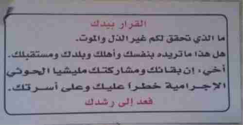 أسقطت مقاتلات التحالف العربي، اليوم السبت، منشورات جديدة على محافظة الحديدة الساحلية، تدعو السكان إلى رفض القتال إلى جانب الحوثيين. وبحسب المنشورات التي تم إسقاطها فإنها تخاطب سكان الحديدة بالقول: ما الذي تحقق لكم غير الموت والذل، هل هذا ما تريده لنفسك، وأهلك، وبلدك، ومستقبلك". وجاء فيها: أخي إن بقائك ومشاركتك مليشيا الحوثي الإجرامية خطرا عليك وعلى أسرتك، فعد إلى رشدك". يأتي هذا في ظل معارك تدور رحاها على جبهة الساحل الغربي، في محاولة للتقدم نحو ميناء الحديدة.