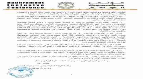 حيا مؤتمر حضرموت الجامع الذكرى الأولى لانعقاد في 22 ابريل 2017 التي جمعت مختلف أطياف المجتمع الحضرمي ومكوناته القبلية والمدنية ؛ يمثلون الشرائح الاجتماعية والقوى السياسية والحزبية والاتحادات النقابية والمهنية والاجتماعية والشعبية ومنظمات المجتمع المدني والشخصيات العامة والمثقفين والأكاديميين على اختلاف توجهاتهم الفكرية وانتماءاتهم السياسية ومواقعهم الاجتماعية ،و الذين تقاطروا من كل المناطق والمديريات ساحلًا وواديًا وهضبة وصحراء رجالا ونساء شبابا ، تلبيةً لنداء حلف حضرموت مجسدين روح الإخاء والترابط والتعايش قولًا وعملًا وثقافة وتصالحًا وتسامحًا ، وتضامنًا بين كل مكونات المجتمع الحضرمي.