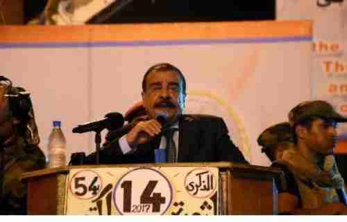 تأتي احتفالاتنا في هذا العام بمحافظة حضرموت ونحن في ظروف غاية في الصعوبة والتعقيد بفعل تلك التركة المثقلة التي ورثناها جراء الأزمة السياسية وما ترتب على ذلك من قلب الموازين وخلط الأوراق التي كانت نتائجها وبال على جماهير شعبنا وما لحق ذلك من احتلال للعاصمة عدن وتدمير واحتلال محافظات الجنوب والدفع بقوى الشر تحت غطاء تنظيم القاعدة باحتلال مدينة المكلا وكافة مناطق ساحل حضرموت ذلك الاحتلال الذي أستمر لمدة عام كامل وما خلفه من أزمة في كثير من الخدمات وتعطيل الحياة العامة وإغلاق المؤسسات ومكاتب ومرافق ومنشآت الدولة وسرقة كل محتوياتها وأموالها . إن تلك القوى التي خططت لتدمير محافظاتنا الجنوبية هي تلك القوى التي خططت لسرقة ثوراتها وطمس تاريخها.. وفهموا الوحدة بأنها ضم وإلحاق وأفرغوها من محتواها . وهم من كان ولا زالوا وراء عمليات اغتيالات أبناء الوطن في عدن ومحافظات الجنوب عامة واعتقلوا ونكلوا بالشرفاء من أبناء الوطن .. هذه القوى الشريرة التي لا تستطيع العيش الا على مزيد من الحروب والسلب والنهب والسطو على مقدرات وثروات الوطن والبسط على أراضي الدولة والمواطنين دون تمييز بهدف الإثراء وجمع الأموال التي حولتها إلى سلاح فتاك في حربها ضد أبناء الشعب ومعتمدة في ذلك على المكر والغش والخداع وإيهام العامة بالوطنية والتمترس خلف السواتر والشعارات الدينية التي هي منهم براء فهم من يرفعون شعارات الوطن والثورة نهاراً ويطعنونها ويغتالونها ليلاً . لقد كشفت تلك العناصر والقيادات عن وجهها القبيح الذي أخفته طوال عقود من الزمن خلف شعارات الإخلاص والولاء للوطن ومصالح المواطنين وهي التي دمرت كل شيء جميل تم بناءه بعرق وجهد المواطنين ونهبت ثرواتهم ومزقت نسيجهم الاجتماعي ودمرت بنيته ومؤسساته المدنية والعسكرية والأمنية ..