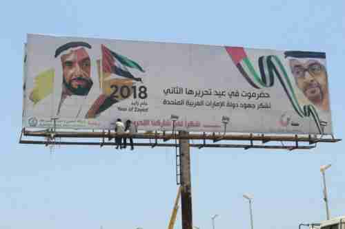 وقال رئيس حملة «ماقصرتوا عيال زايد» محمد بوعيران إن رفع هذه اللوحات العملاقة إنما يقصد بها التعبير عن العرفان والشكر والتقدير لقادة دولة الإمارات الشقيقة لدورهم البارز في تحرير هذه المحافظة من براثن تنظيم الإرهابي، وإغاثة أهلها وتقديم المساعدات الإنسانية لهم، مؤكداً ارتياح أبناء حضرموت للدعم السخي الذي يقدمونه أولاد زايد.