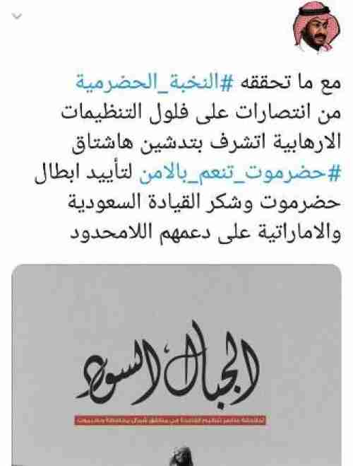 دشن ناشطين من ابناء حضرموت حملة شكر للامارات العربية المتحدة والتحالف العربي بقيادة المملكة العربية السعودية وانطلقت الحملة الليلة الأحد في تويتر ومواقع التواصل الاجتماعي تحت هشتاق #حضرموت_تنعم_بالأمن وتأتي الحملة لتشكر من لهم الدور في تأمين حضرموت ودعم استقرارها والعمل على حمايتهها الحملة جاءت بالتزامن مع عملية الجبال السود عملية مطاردة فلول الارهاب من جبال حضرموت الشمالية والغربية من قبل قوات النخبة الحضرمية وباسناد التحالف العربي واشراف مباشر من قبل الامارات العربية المتحدة .صحفة الكاتب هاني مسهور