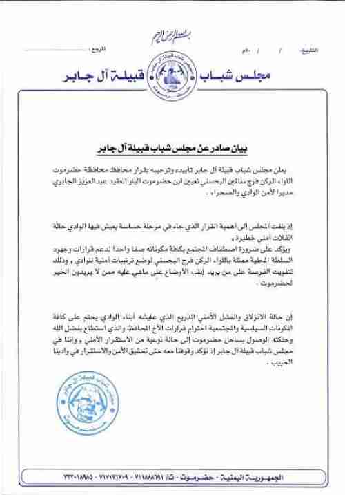 إن حالة الانزلاق والفشل الأمني الذريع الذي عايشه أبناء الوادي يحتم على كافة المكونات السياسية والمجتمعية احترام قرارات الأخ المحافظ والذي استطاع بفضل الله وحنكته الوصول بساحل حضرموت إلى حالة نوعية من الاستقرار الأمني , وإننا في مجلس شباب قبيلة آل جابر إذ نؤكد وقوفنا معه حتى تحقيق الأمن والاستقرار في وادينا الحبيب .