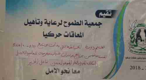 اختتمت الدورة التدريبية في الخياطة التي تنظمها جمعية الطموح لرعاية وتأهيل المعاقات حركياً ضمن برنامج مبادرات شباب حضرموت للعلم والعمل لمكافحة الجهل والفقر الموصولة من فاعل خير .