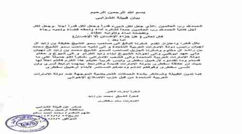 اعلنت قبيلة الشزبيون كبرى قبائل سقطرى رفضها لحملات التشهير التي تسقطرىلها دولة الامارات العربية من قبل حزب الاصلاح الاخواني.. وثمن البيان الصادر للوقفة التضامنية لقبيلة الشيزبيون الدور الانساني الكبير لا ولاد زايد وماقدموه من مشاريع للبنية التحتية ونهوض تنموي غير مسبوق اعاد الحياة الى الارخبيل كما لم تشهده الجزيرة من قبل.