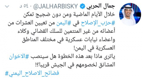 وقال "الحربي"، في تغريده نشرها عبر صفحته بموقع التواصل الاجتماعي تويتر،: انه " خلال الأيام الماضية ومن دون ضجيج تمكن حزب الإصلاح، في اليمن من تعيين العشرات من أعضائه من غير المنتمين للسلك القضائي وكلاء واعضاء نيابات عسكرية في مختلف المناطق العسكرية في اليمن! " .