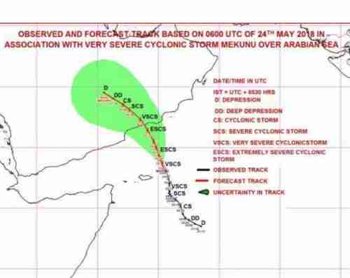 حيث هناك احتمالان لسير هذا الاعصار اما ان يضرب ظفار وهذا لا يعني انه التأثير قليل بل خطر جدار الاعصار كبير فالتوقعات تشير الى ان يتجه غربا ويؤثر على المهرة بأمطار وفيضانات عارمة ورياح شديدة بين 60-70 أو انه قبل وصوله ظفار يضرب المهرة مباشرة برياح شديدة جدا بين 70 -90 وفيضانات عارمة ستطال تلك المحافظة.