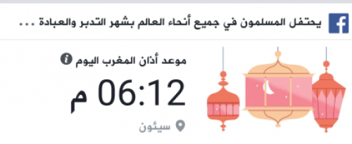 وأفادت إدارة الفيسبوك بأن يظهر لدى الأشخاص على فيسبوك في بعض المناطق رسالة في أعلى قسم آخر الاخبار توضح لهم موعد آذان المغرب للأخوة المسلمين الذين يحتفلون بشهر رمضان الكريم.