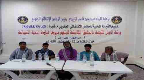 برعاية اللواء عيدروس قاسم الزبيدي رئيس المجلس الانتقالي الجنوبي دشنت مساء يوم الإثنين الموافق 29مايو 2018م بمدينة عزان القيادة المحلية للمجلس الانتقالي الجنوبي م/شبوة (الادارة القانونية) ورشة العمل للتوعية بالحقوق القانونية للمتهم بمركز قيادة النخبة الشبوانية (محور عزان) وتستمر ورشة العمل ليومين خلال الفترة من 12-13رمضان 1439هجريه التي تقوم بها الادارة القانونية للمجلس الانتقالي بالمحافظة.