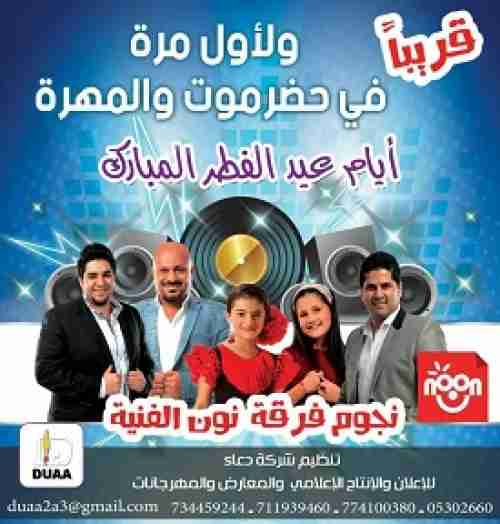 كشف المدير التنفيذي لشركة دعاء للإعلان للإنتاج الإعلامي والمعارض والمهرجانات الأستاذ نوفل علي الهندي عن تلقيهم مئات الاتصالات منذ اليومين الماضية من المواطنين الفرحين والمتلهفين لاستضافة شركة دعاء لفرقة نجوم نون الفنية بمحافظتي حضرموت والمهرة ومستفسرين كذلك عبر اتصالاتهم بالشركة من خلال ارقام تواصلها الثابتة والمحمولة وكذا عبر صفحاتها عبر مواقع التواصل الاجتماعي وبريدها الالكتروني عن مواقع بيع التذاكر وأماكن الحفلات وأسعارها واستفسارات أخرى تتعلق بالمهرجان.