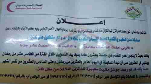 برعاية الهلال الأحمر الإماراتي مكتب اوقاف وإرشاد عدن يعلن عن مسابقة عدن الكبرى لحفظ القرآن الكريم