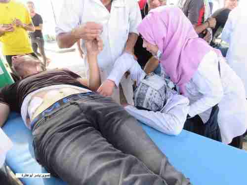 وعلى الفور انتابت المسعفة حالة من البكاء والهستيريا بعد أن رأت زوجها مُلقى على حمّالة نقل المصابين، وحالته الصحية متوسطة.