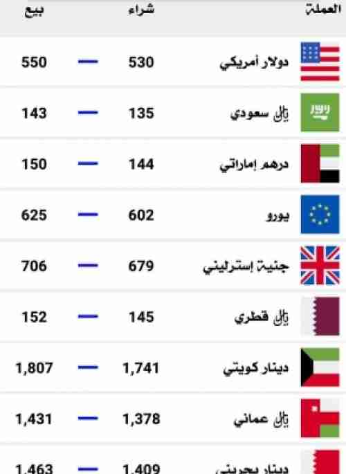 سجل الريال اليمني صعوداً ملحوظاً أمام العملات الأجنبية، وعلى وجه التحديد الدولار الأمريكي والريال السعودي، وذلك بعد أسابيع من التدهور المستمر . وأسهمت الإجراءات الحكومية الأخيرة في إيقاف تدهور الريال اليمني، وإستعادة عافيته، وسط مؤشرات إيجابية تنبئ بعودة الإقتصاد اليمني إلى حالته الطبيعية . وفيما يلي آخر أسعار بيع وشراء العملات أمام الريال اليمني :