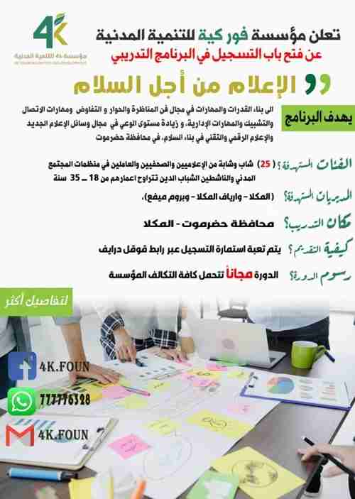 اعلنت مؤسسة 4k للتنمية المدنية عن فتح باب القبول والتسجيل في البرنامج التدريبي لمشروع الإعلام من أجل السلام، بالتعاون مع شركة سما للإعلام، والذي ينفذ في مديرية المكلا بمحافظة حضرموت.
