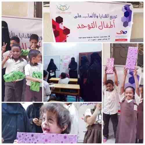 صدى" توزع الهدايا والألعاب على أطفال التوحد والداون بالمكلا