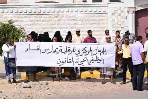 نفذ العشرات من موظفي الجهاز المركزي للرقابة للمحاسبات اليوم بالعاصمة عدن وقفة احتجاجية للمطالبة باستكمال إجراءاتهم الوظيفة والتنديد بالفساد والاقصاء الوظيفي والمحسوبية . ورفع المحتجون لافتات معبرة بالمحسوبية والفساد مؤكدين أنهم قضوا عقد من الزمن من العمل بوظائفهم وفق لقرار رئيس الجمهورية ومجلس الوزراء رقم 94 ووفقا للفتوى الصادرة من وزارة الخدمة المدنية للعام 2011 م ، إلا أن قيادة الجهاز رافضة ترتيب وضعهم الوظيفي بحجة أن قانون الجهاز لا ينطبق على الموظفين ، بينما يتم التحايل بتوظيف مقربين وأصحاب الوساطات وإصدار لهم لهم فتواى ما بعد 2011 م . موضحين أن لداء الجهاز 200 درجة وظيفية جديد بدل متقاعدين بالإضافة إلى حاجته لموظفين بمختلف التخصصات . وطالب المحتجون فخامة رئيس الجمهورية عبدربه منصور هادي ورئاسة الحكومة ورئاسة المجلس الانتقالي وكل الجهات المعنية إلى الوقوف إلى جانب الموظفين المقصين من أعمالهم ومحاربة الفساد والمحسوبية التي تمارس ضد الموظفين منذ 9 سنوات دون رقيب أو حسيب .