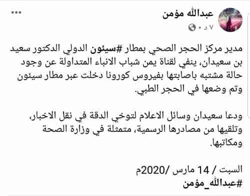 نفى مدير مركز الحجر الصحي بمطار #سيئون الدولي الدكتور سعيد بن سعيدان، لقناة يمن شباب الانباء المتداولة عن وجود حالة مشتبه باصابتها بفيروس كورونا، والتي يقال عنها بانها قد دخلت عبر مطار سيئون وتم وضعها في الحجر الطبي.