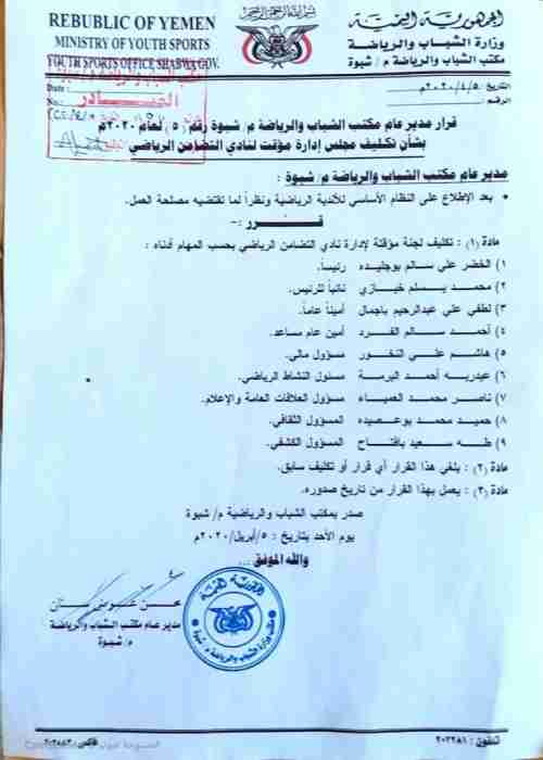 مدير مكتب الشباب والرياضة بشبوة يصدر قراراً بتشكيل مجلس ادارة مؤقت لإدارة نادي التضامن الرياضي والثقافي.