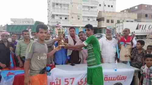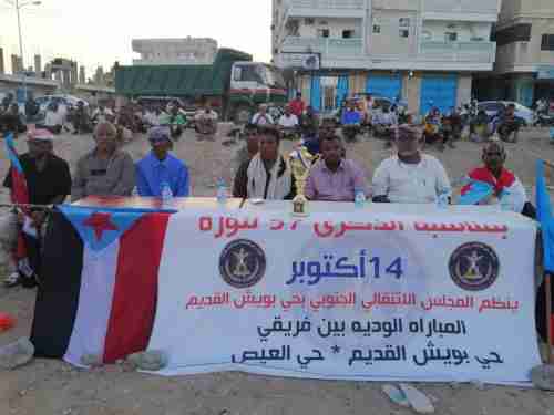 نظمت مراكز مناطق بويش والعيص للقيادة المحلية للمجلس الانتقالي بمديرية المكلا مباراة وديه بين فريق حي بويش وفريق حي العيص احتضنها ملعب القلعة ابتهاجاً بالذكرى الـ57 لثورة 14 أكتوبر المجيدة. و قدم الفريقين مباراة شيقه وممتعه الهبت حماس الجمهور، ومنافسة قوية طوال الشوطين بنتيجة سلبية لكل منهما، وانتهت المباراة بركلات الترجيح بفوز فريق بويش على فريق العيص. و في ختام المباراة سلم مدير إدارة الشباب والطلاب للقيادة المحلية بمديرية المكلا الاخ علي الطمبشي إلى جانب الكابتن خالد بامجحفي رئيس فريق القلعة ورئيس مركز العيص الاخ عوض باحويرث ورئيس مركز بويش الاخ عمر الحيقي ورئيس حي العيص الاخ محمد بخضر كأس 14 أكتوبر للفريق الفائز.