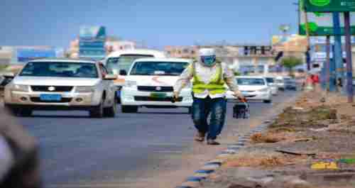 دشن مكتب الاشغال العامة والطرق بعدن العمل في طلاء جوانب الطريق (البردورات) والارشادات التعريفية ورفع لوحات السلامة المرورية في الطريق البحري.