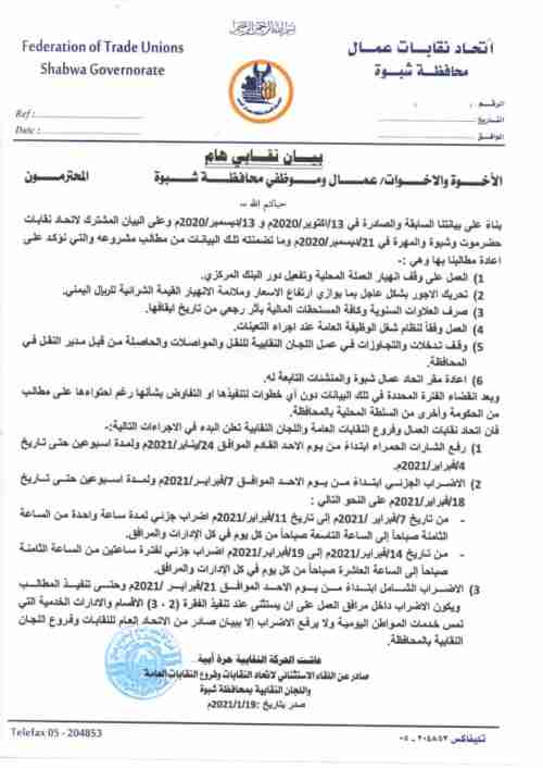 اتحاد نقابات عمال شبوة يقر أضراب شامل في 21 فبراير والمطالبة باعاده مقر أتحاد نقابات المحافظة والمنشآت التابعه له