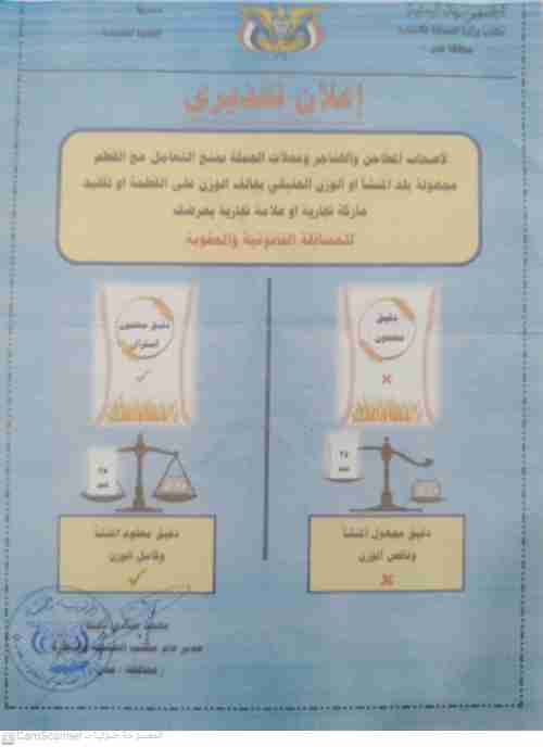 وجاء في "الإعلان" تحذير لأصحاب المطاحن ومحلات الجملة التجارية بمنع التعامل مع قطم الدقيق مجهولة المنشأ او الوزن الحقيقي الذي يخالف الوزن الموجود في قطمة الدقيق او تقليد لماركة أو علامة تجارية الأمر الذي يعرضك التاجر للمساءلة والعقوبة القانونية .