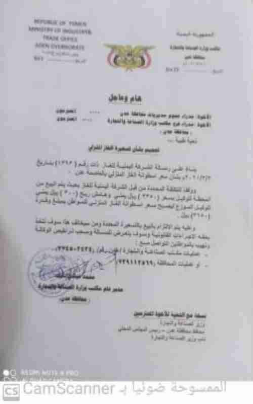 وياتي هذا التعميم بناءا على رسالة الشركة اليمنية للغاز ذات رقم (١٣٩٣) بتاريخ ٣/٣/٢٠٢١ والخاصة بسعر اسطوانة الغاز المنزلي بـ العاصمة المؤقتة عدن .