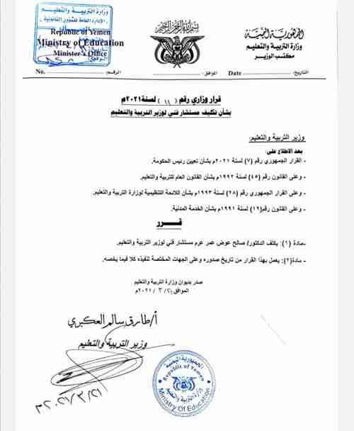 أصدر وزير التربية والتعليم الأستاذ طارق سالم العكبري قرارا رقم (١١) لسنة ٢٠٢١م قضي بتكليف الدكتور صالح عوض عمر عرم مستشارا فنيا لوزير التربية والتعليم.