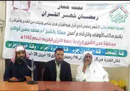اختمت الادارة العامة لمكتب الاوقاف والارشاد للعاصمة عدن عصر الاربعاء المسابقة الكبرى الرابعة لحفظ القرآن الكريم التي تأتي في عامها الرابع منذ انطلاقتها في العاصمة عدن .