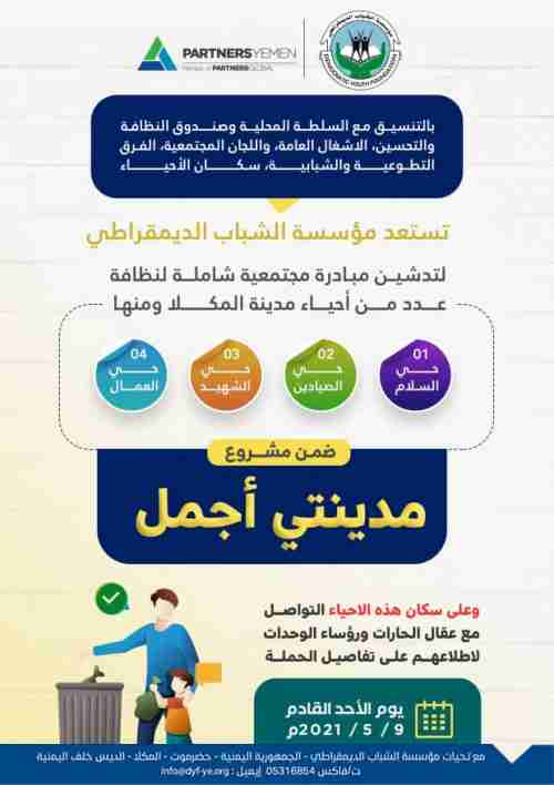 تستعد مؤسسة الشباب الديمقراطي بالتنسيق مع السلطة المحلية بمحافظة حضرموت وصندوق النظافة والتحسين بالإضافة إلى اللجان المجتمعية , وبتمويل من منظمة شركاء اليمن لتدشين حملة نظافة كبرى ضمن مشروع مدينتي أجمل، في عدد من أحياء مدينة المكلا.