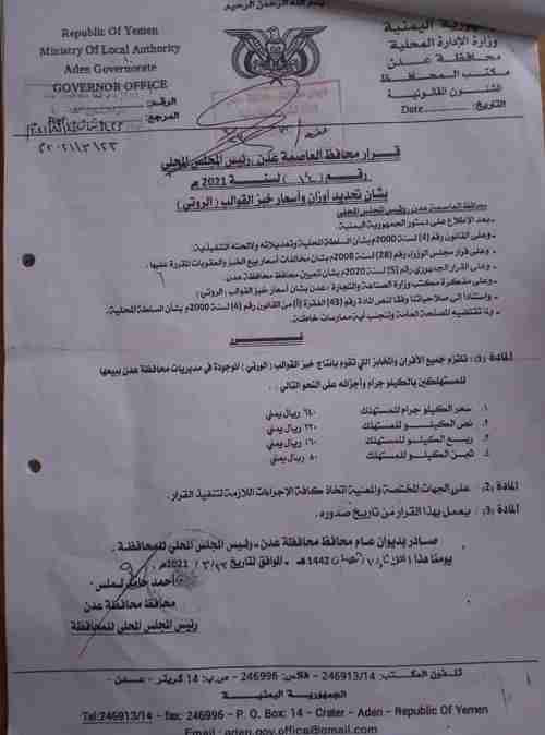 وأكد المكتب أن التعميم الصادر عن إدارة الأمن جاء بناء على قرار محافظ العاصمة عدن الاستاذ أحمد حامد لملس ومكتب الصناعة والتجارة وجمعية المخابز والأفران بالعاصمة والجهات المختصة بتحديد الأسعار والأوزان الواردة في التعميم.