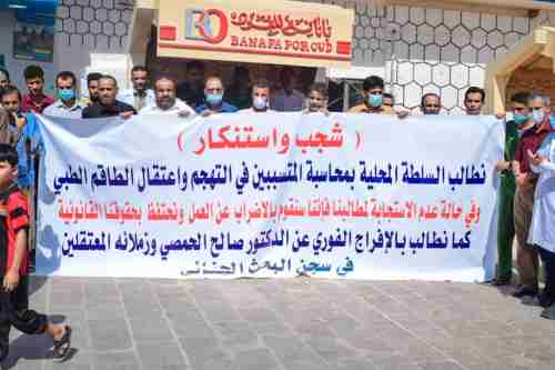 وقفة احتجاجية لإطباء محافظة شبوة للمطالبة بالإفراج على زملائهم