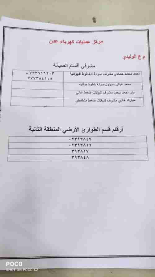 وناشد كافة المواطنين ان يكونوا عونا وسندا للمؤسسة في الابلاغ عن شكا ويهم عبر ارقام غرفة العمليات المشتركة، وفي التجاوب مع المؤسسة بعدم الربط العشوائ من خطين لماله من اضرار كارثيةفي ضرب الكابلات وانقطاع خطوط نقل التيار،ناهيك عن.الأضرار.التي قد تتسبب نتيجة اشتعال الحرائق في منازل المواطنين لاسمح الله.داعيا الجميع الى التفاعل في تسديد فواتيرالإشتراك الشهري..