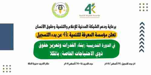 مؤسسة المعرفة للتنمية 4K تعلن عن بدء التسجيل في الدورة التدريبية (بناء القدرات وتعزيز حقوق ذوي الاحتياجات الخاصة) بمحافظة حضرموت