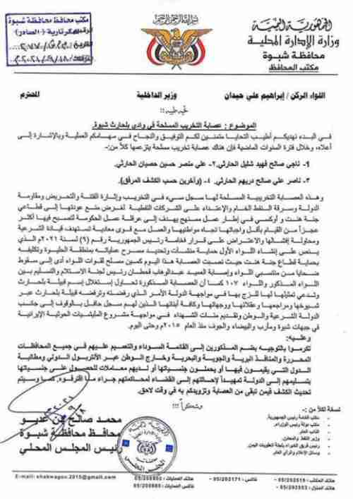 مذكرة من محافظ شبوة يصف فيه اعيان من قبائل “بلحارث” بالبلاطجة وقطاع طرق