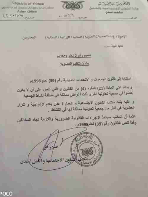 أصدر القائم بأعمال المدير العام لمكتب وزارة الشؤون الاجتماعية والعمل في العاصمة عدن الأستاذ أرسلان السقاف ،بالتنسيق مع إدارة الجمعيات والاتحادات الاهليه ممثلة بعصام وادي مدير إدارة الجمعيات والاتحادات الاهليه لمكتب الوزارة بعدن جملة من القرارات والتعاميم لتفعيل الرقابة القانونية والفنية على أنشطة عمل منظمات المجتمع المدني العاملة في العاصمة عدن وترتيب الوضع القانوني للكثير من الجمعيات الأهلية والتعاونية التي انتهت فترة عمل هيئتها الإدارية  بموجب القانون وهذه القرارات والإجراءات عالنحو التالي :                                                                              أولا : الإجراءات بشأن تجديد التصاريح السنوية لعمل  المنظمات والجمعيات الأهلية بموجب قانون الجمعيات والاتحادات الاهلية وفق الشروط القانونية التالية :                                                                   ١) تقديم التقرير المالي لأنشطة المنظمة  ويشمل تقديم كافة الحسابات البنكية بكشوفات رسميه مع مصادر تمويل  الجمعية واعتماد التقرير المالي من محاسب قانوني معتمد في محافظة عدن .                               ٢)التقرير الإداري يوضح جملة الأنشطة المنفذة خلال الفترة المنصرمة للعام الماضي.                                               ٣) عقد الاجتماع الانتخابي للجمعيات المنتهية شرعية مجلس إدارتها القانونية المحددة وفق القانون بثلاث سنوات.                                                                                          ٤)تقديم طلب رسمي بطلب التجديد  موجه لمكتب الوزارة بعدن مختم من رئيس المنظمة أو الجمعية مع تقديم وثيقة عقد ايجار مقر المنظمة أو الجمعيه سارية المفعول.                                                    ٥) تقديم الخطة السنوية لأنشطة ومشاريع  المنظمة أو الجمعية للعام الجديد ومصادر تمويلها .                                                                       ٦) تقديم كشف نهائي غير مزدوج لكافة أعضاء الجمعية العمومية والهيئة الإدارية للجمعية معتمد بختم الجمعية وعلى مسؤلية مجلس إدارتها لمطابقتها مع وثائقهم في أرشيف مكتب الوزارة بعدن .                                                                                        ٧) يؤكد مكتب وزارة الشؤون الاجتماعية والعمل في العاصمة عدن بأنه لم يبث بأي طلب تجديد مالم يكن مستوفي الشروط القانونية المذكورة أعلاه .                                    ثانيا: جملة القرارات في ترتيب الوضع القانوني للجمعيات التعاونية السكنية والزراعية والسمكية وهي كالتالي:.                                                 ١)بشأن تنظيم العضوية  واستناداً للمادة ٢١ الفقرة ٤ من قانون الجمعيات والاتحادات التعاونية لرقم ٣٩ لعام 1998م والتي تنص على أن لا يكون عضوا في جمعية تعاونية أخرى ذات أغراض مماثلة في منطقة نشاط الجمعية وعليه ينبه مكتب وزارة الشؤون الاجتماعية والعمل عدن بعدم ازدواجية وتكرار العضوية في أكثر من جمعية تعاونية مماثلة لها في النشاط علما أن مكتب الوزارة بعدن سيتخذ الإجراءات القانونية اللازمة تجاه المخالفين وفقا لنص القانون المشار لها أعلاه .                                                                                                          2) على جميع رؤساء الجميعات التعاونية الزراعية والسمكيه والسكنية المنتهية شرعية هيئاتها الإدارية بترتيب أوضاعها القانونيه والتنسيق مع مكتب الوزارة بعدن لعقد الاجتماع الانتخابي لها  قبل أن يقوم المكتب باتخاذ الإجراءات القانونية اللازمة ضدها  بإحالتها للجهات القضائية المختصة لإيقاف تصاريح عملها بموجب القانون .                                                                                                          ٣) تقديم تقرير مالي لأنشطة الجميعات التعاونية مع مصادر تمويلها ويشمل  كشوفات الحسابات البنكية  لهذه الجميعات التعاونية معمدة من محاسب قانوني معتمد في محافظة عدن .                                              