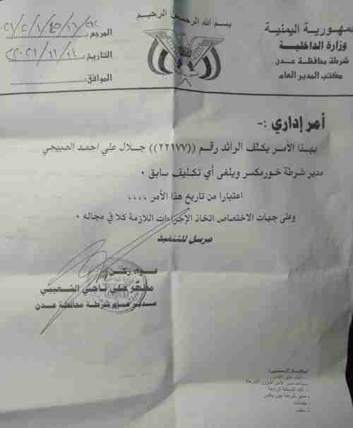 اصدر اللواء ركن" مطهر علي ناجي الشعيبي" مدير عام شرطة العاصمة عدن أمرا اداريا، قضى بتكليف الرائد "جلال علي أحمد الصبيحي" مديراً لشرطة مديرية خورمكسر اعتبارا من الأحد 14 /11/ 2021م، ويلغى أي تكليف سابق. وعلى جهات الاختصاص اتخاذ الاجراءات اللازمة كل في مجاله.