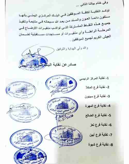 البيان النقابي الثاني الصادر عن نقابة البنك المركزي اليمني في المركز الرئيسي وفرعه في المناطق
