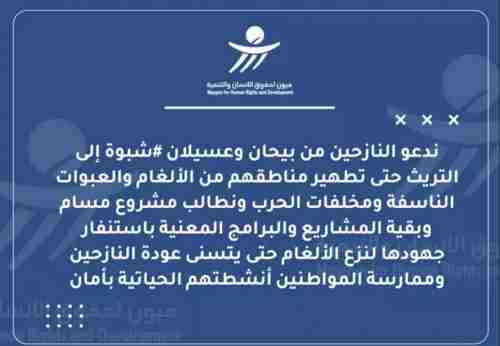 وطالبت في بيانها الفرق الهندسية التابعة لمشروع مسام وبقية المشاريع والبرامج المعنية باستنفار جهودها في مديريات بيحان وعسيلان وعين لنزع الألغام من المناطق السكنية حتى يتمكن النازحون من العودة لمنازلهم وممارسة المواطنين أنشطتهم الحياتية بأمان.